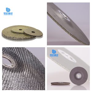 “羅邊玻璃纖維增強砂輪網(wǎng)片 是采用玻璃纖維增強網(wǎng)布涂以酚醛、環(huán)氧改性樹脂,經(jīng)烘培后沖切而成,裁切采用外徑、內(nèi)孔一次沖切成形工藝。因此,網(wǎng)片具有尺寸公差小,同心度好,周邊光潔等優(yōu)點。該產(chǎn)品主要為不織布復(fù)合網(wǎng)片、黒紙復(fù)合網(wǎng)片和純網(wǎng)片,具有極好的耐熱性、高速切割性能及高結(jié)構(gòu)強度。“